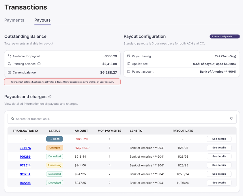 The Balance & Payouts is a central dashboard where partners can monitor their payout activities, including their outstanding balance, pending payouts, and transaction history. This feature also enables users to configure payout preferences, such as payout accounts and payout schedules.